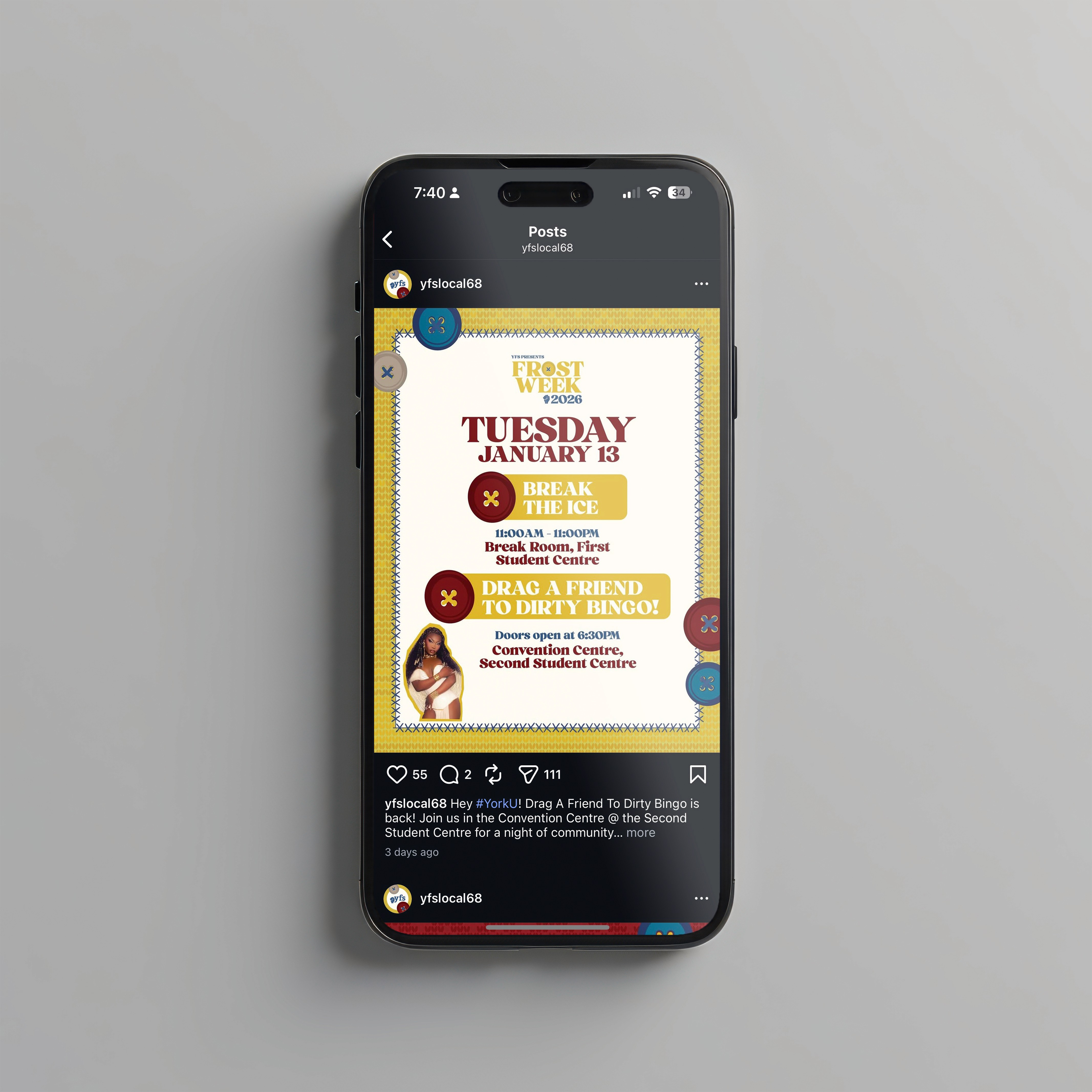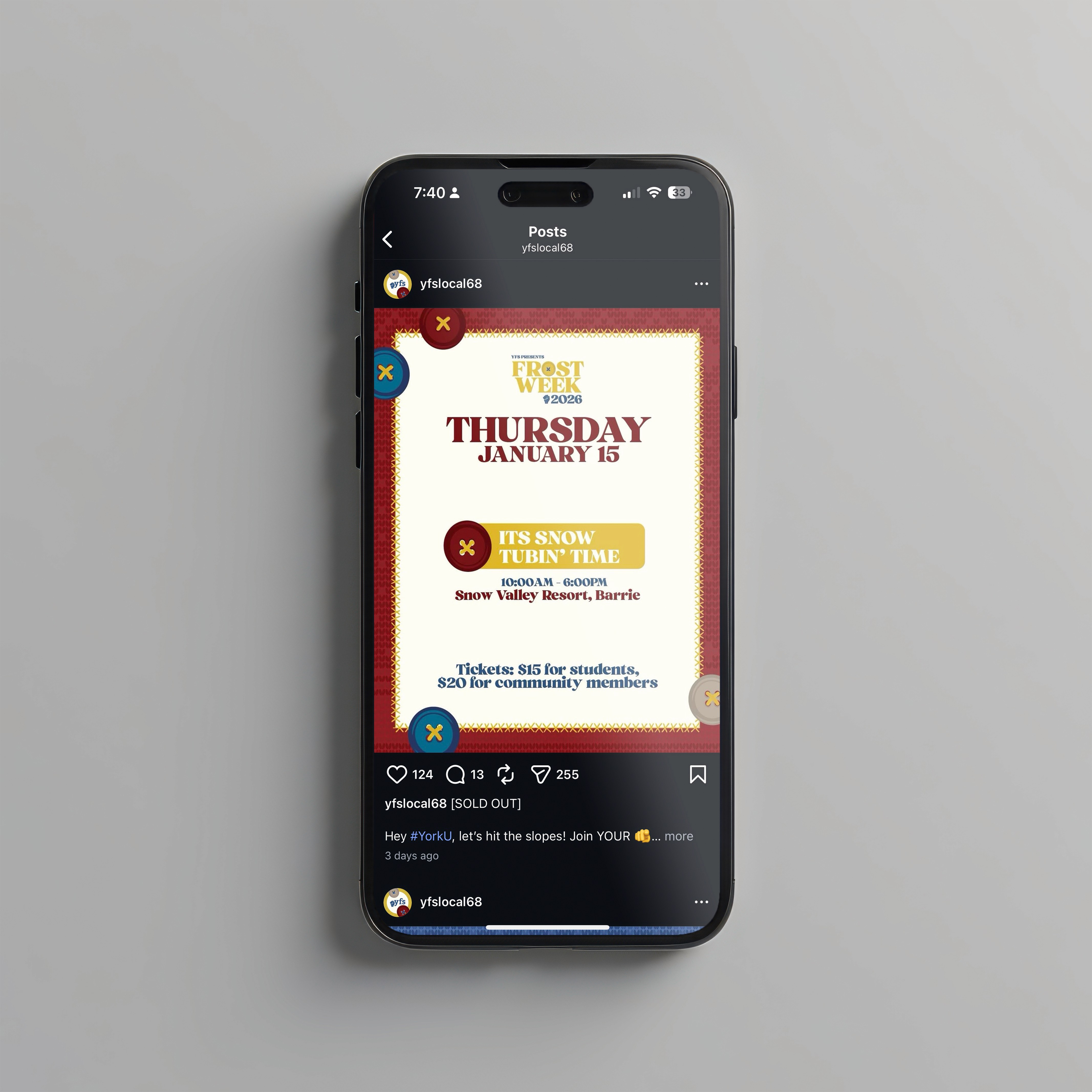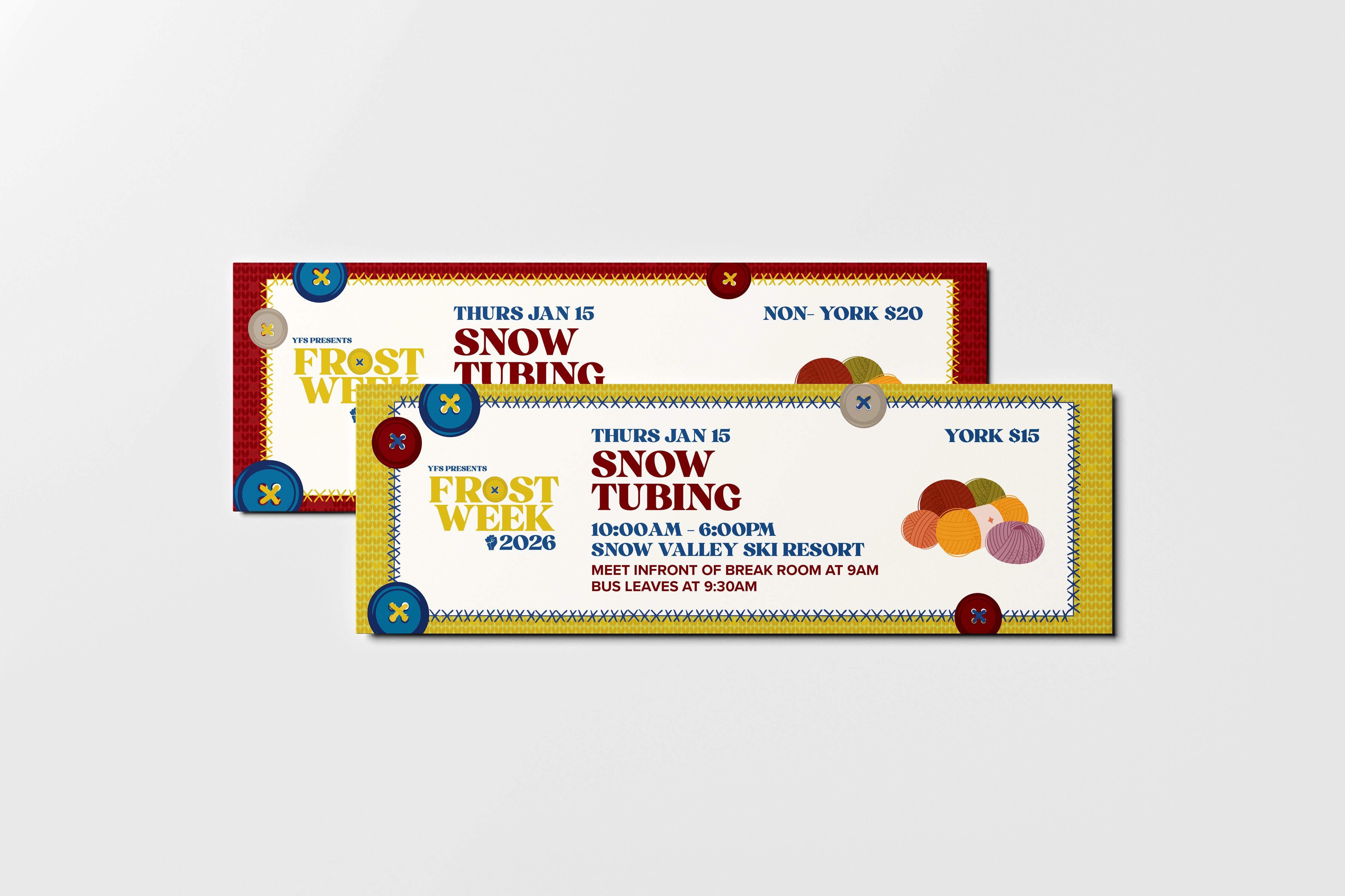 These pieces tie the Frost Week campaign together across digital and physical touchpoints. The web banner promoted the events online, while the tickets use a simple color system, yellow for York students and red for non-York students, to make access easy. The flyer carries the same style, giving students all the info they need in one place while keeping the warm, cozy look consistent across the campaign.