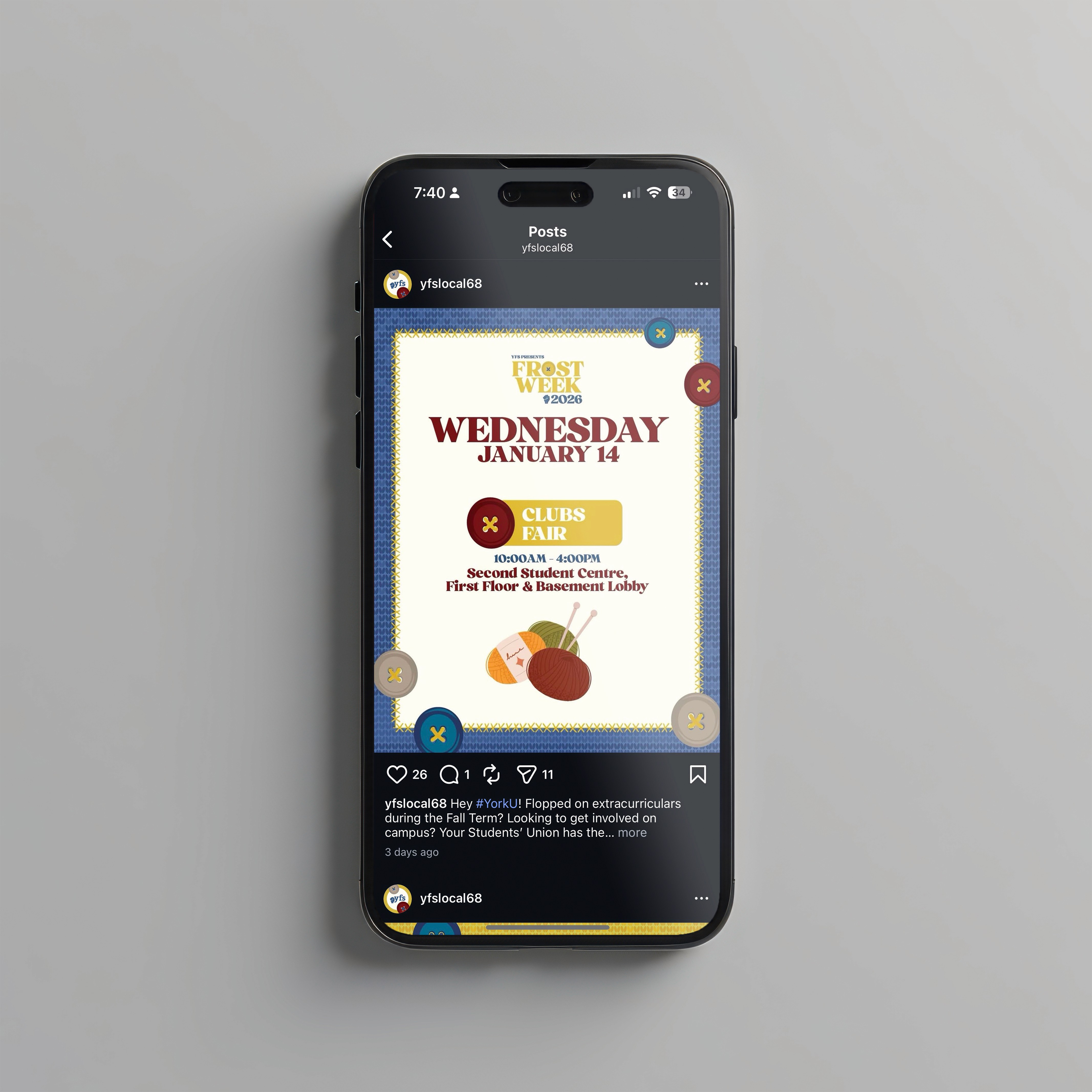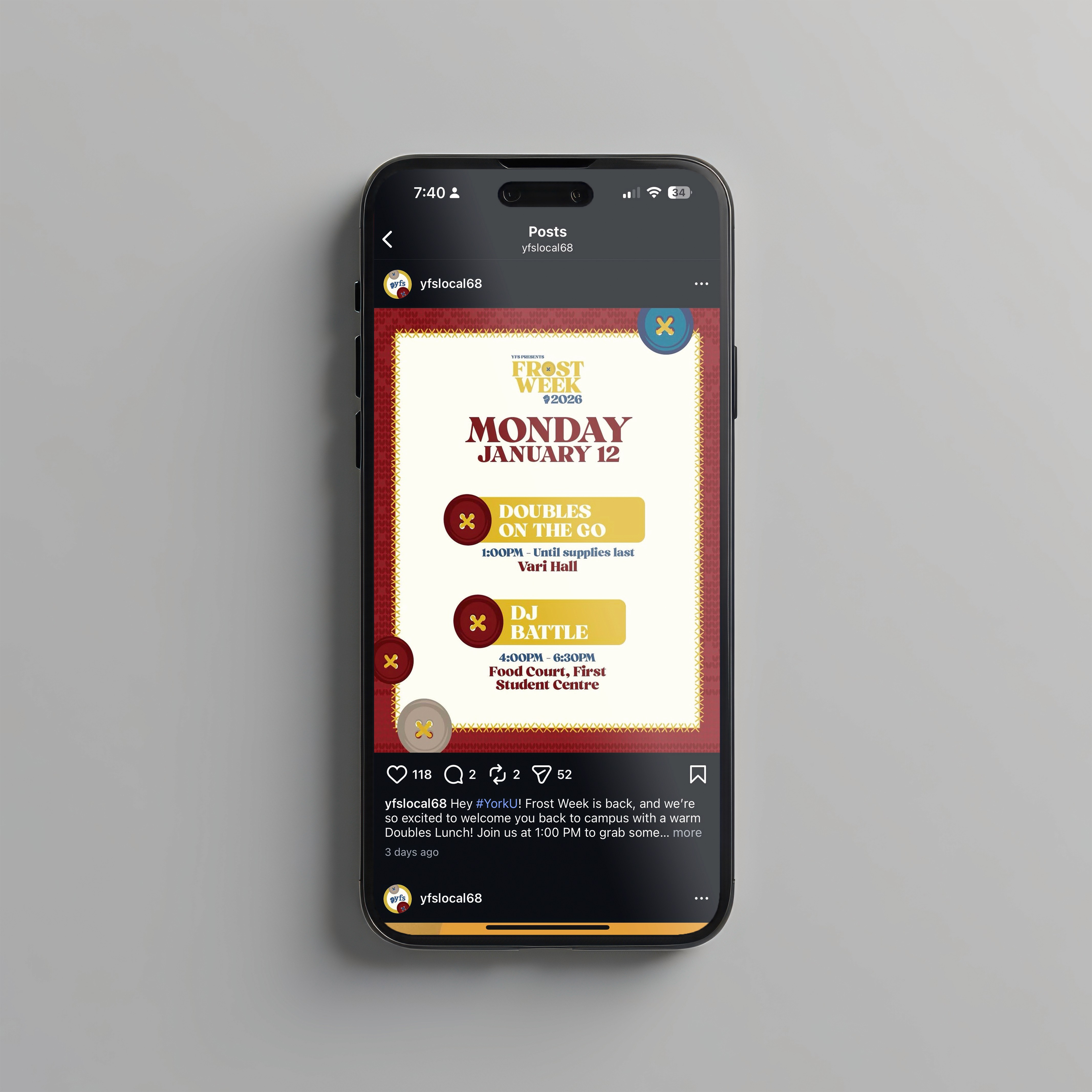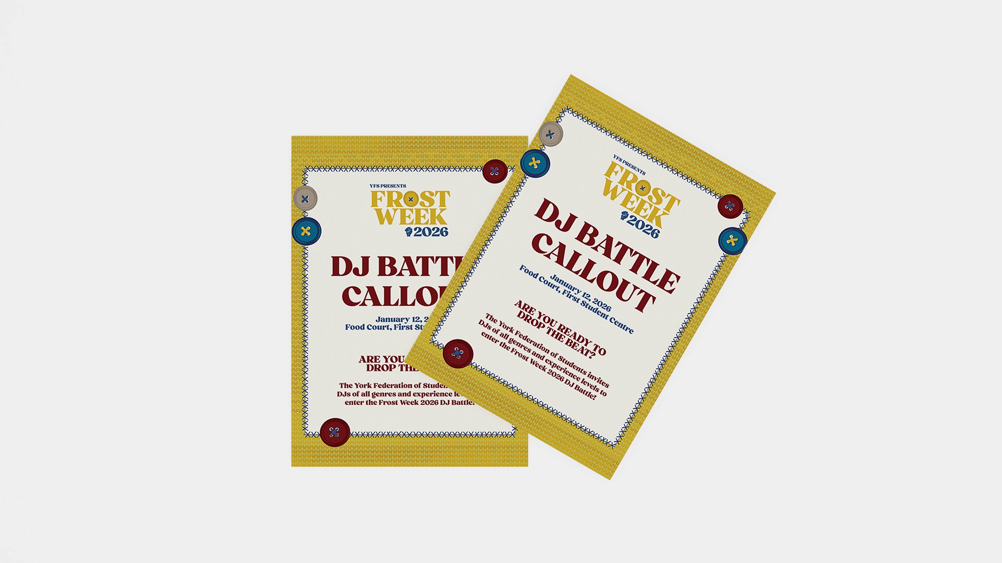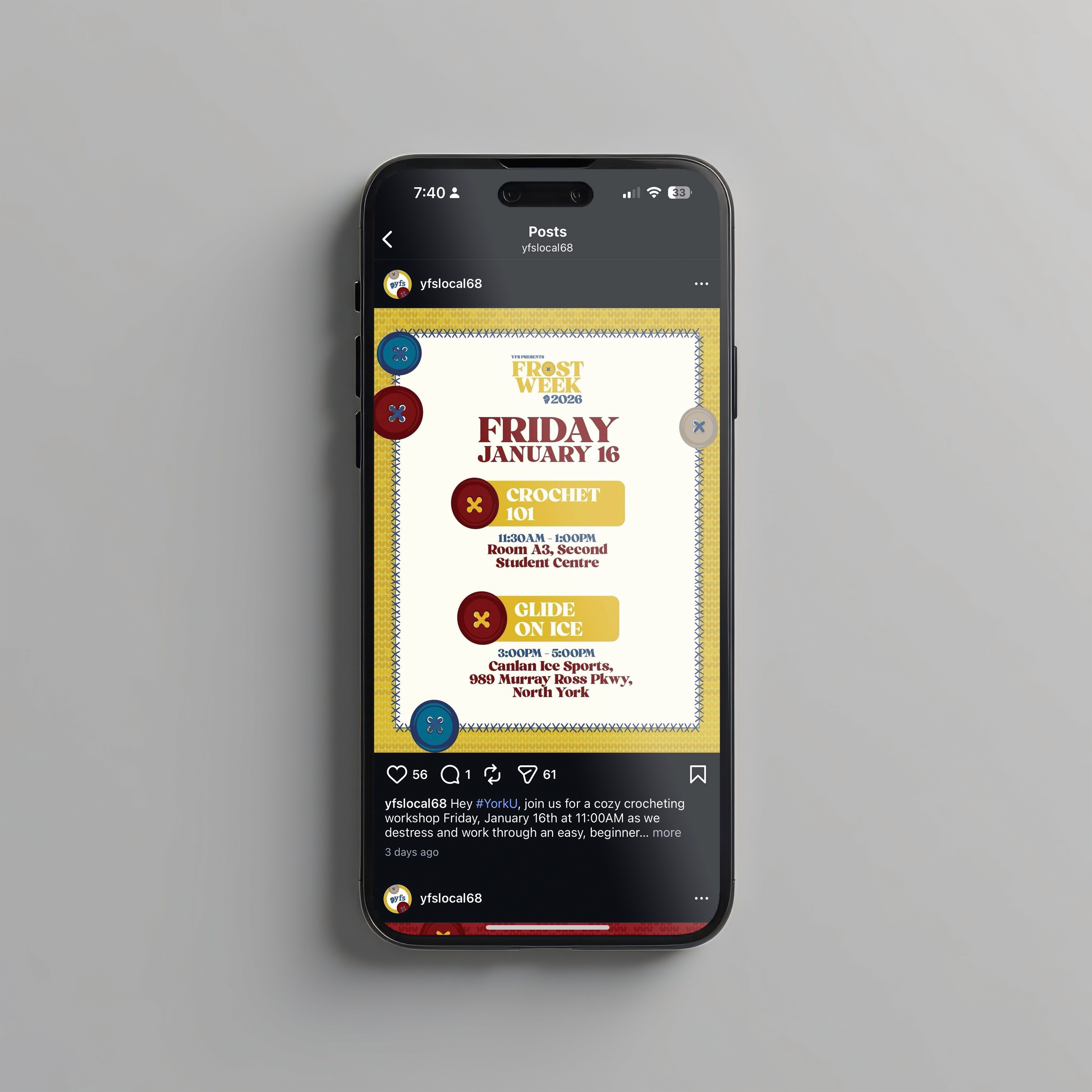These pieces tie the Frost Week campaign together across digital and physical touchpoints. The web banner promoted the events online, while the tickets use a simple color system, yellow for York students and red for non-York students, to make access easy. The flyer carries the same style, giving students all the info they need in one place while keeping the warm, cozy look consistent across the campaign.