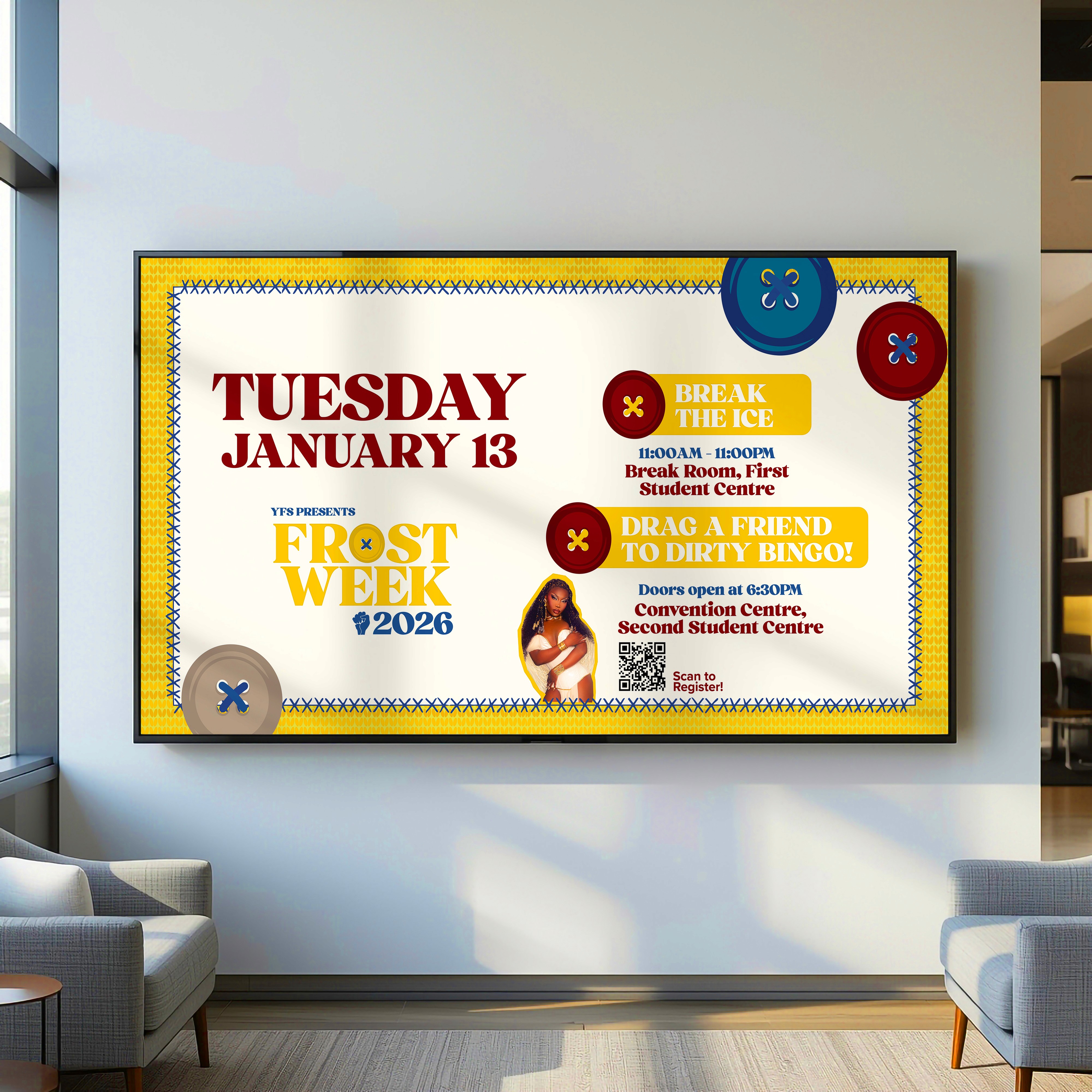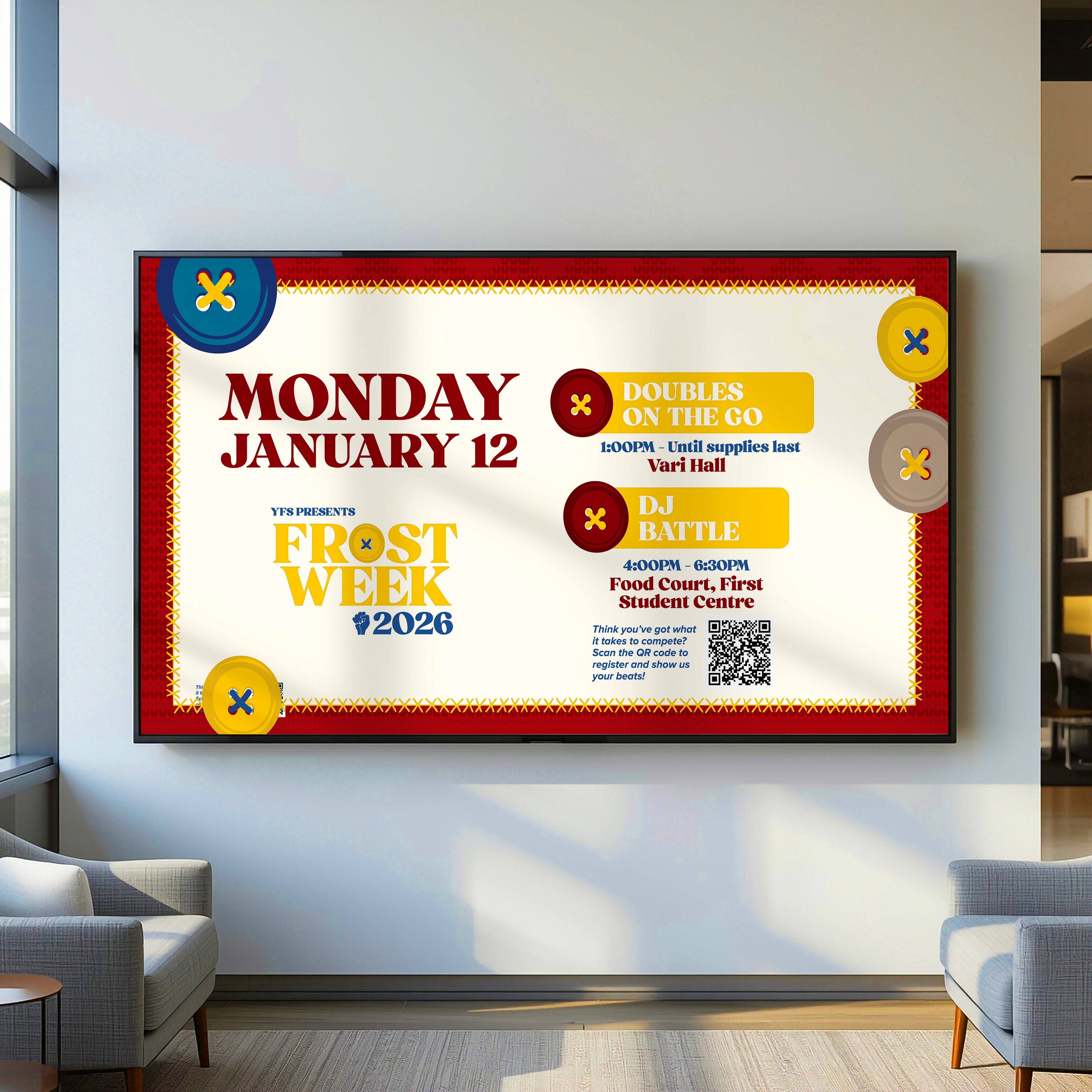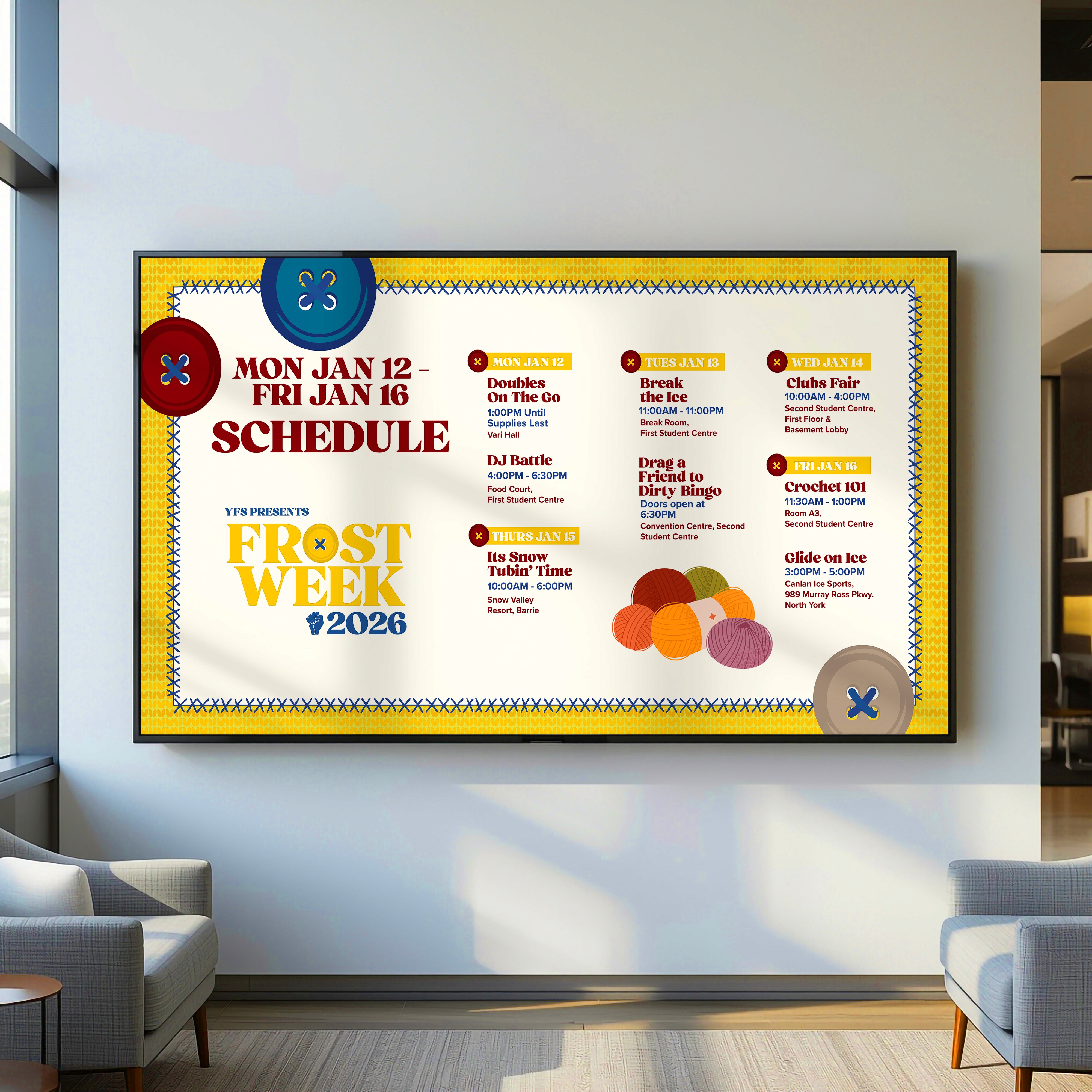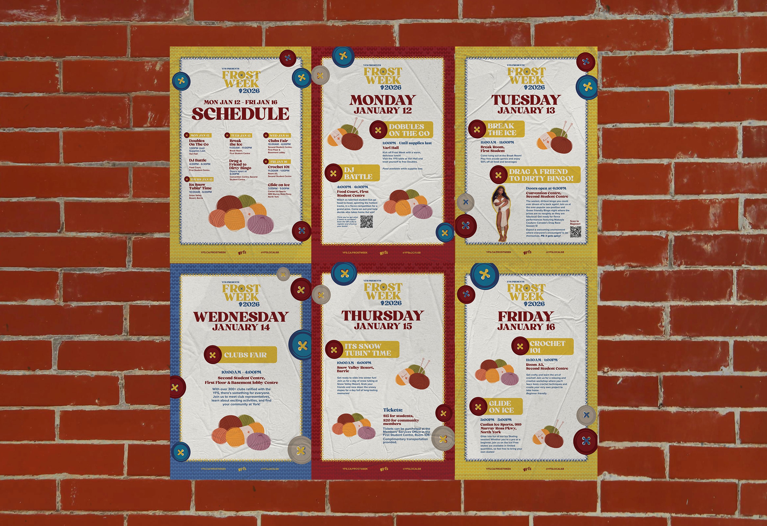 Each design includes the full schedule plus a unique look for each day of Frost Week, giving more context on the events and keeping things visually engaging. Posters and TV screens were displayed around campus, while the Instagram posts brought the designs online, helping students keep up with the schedule wherever they were.