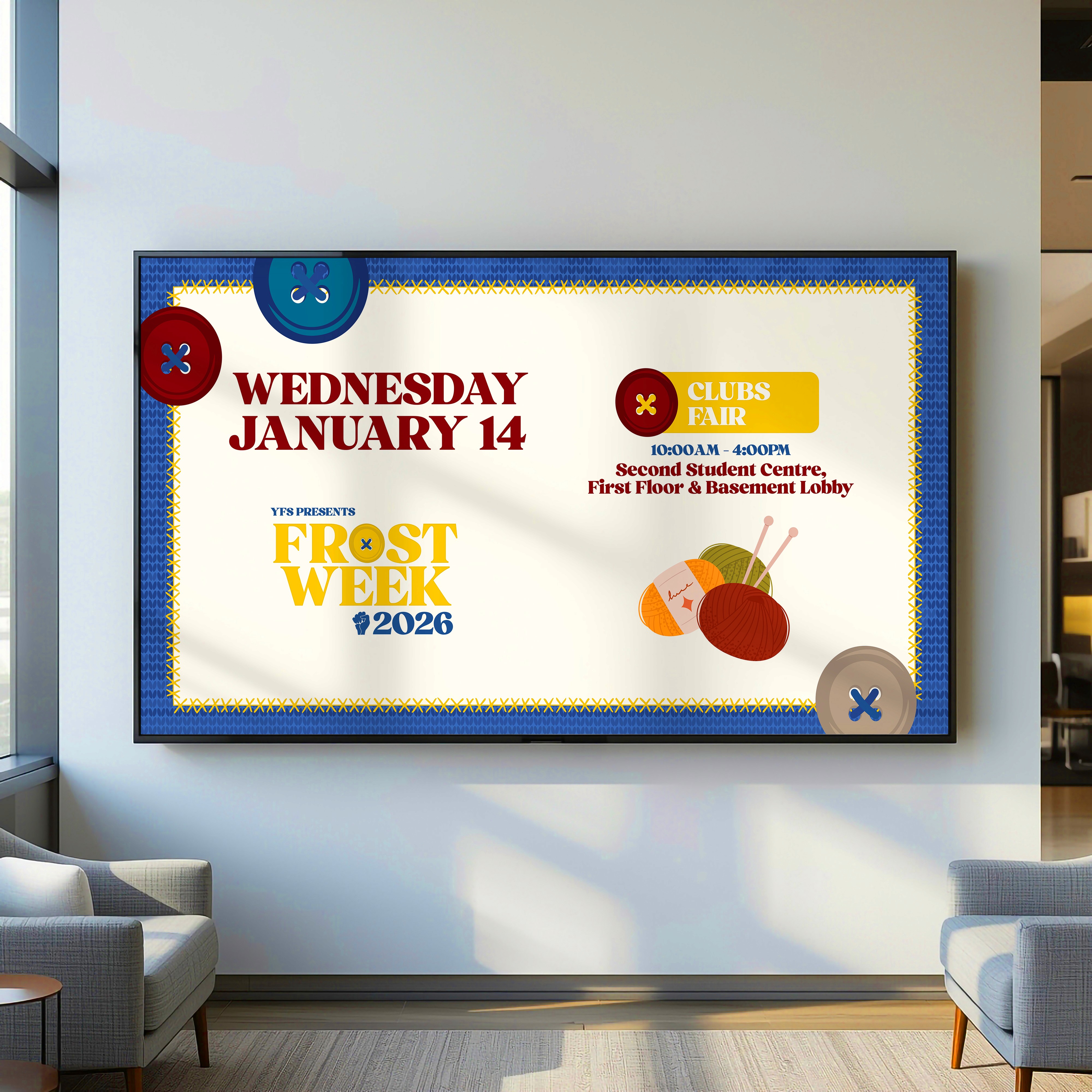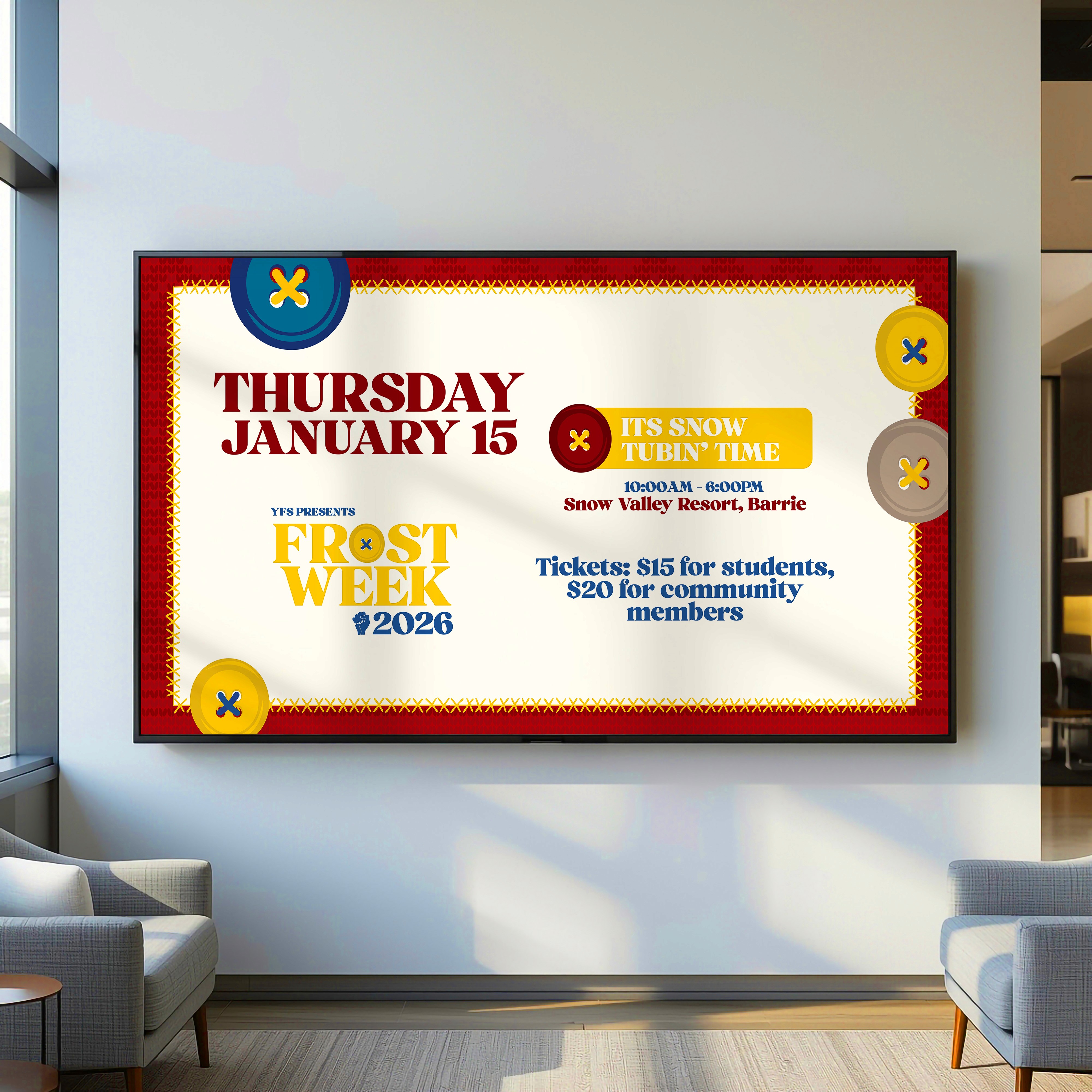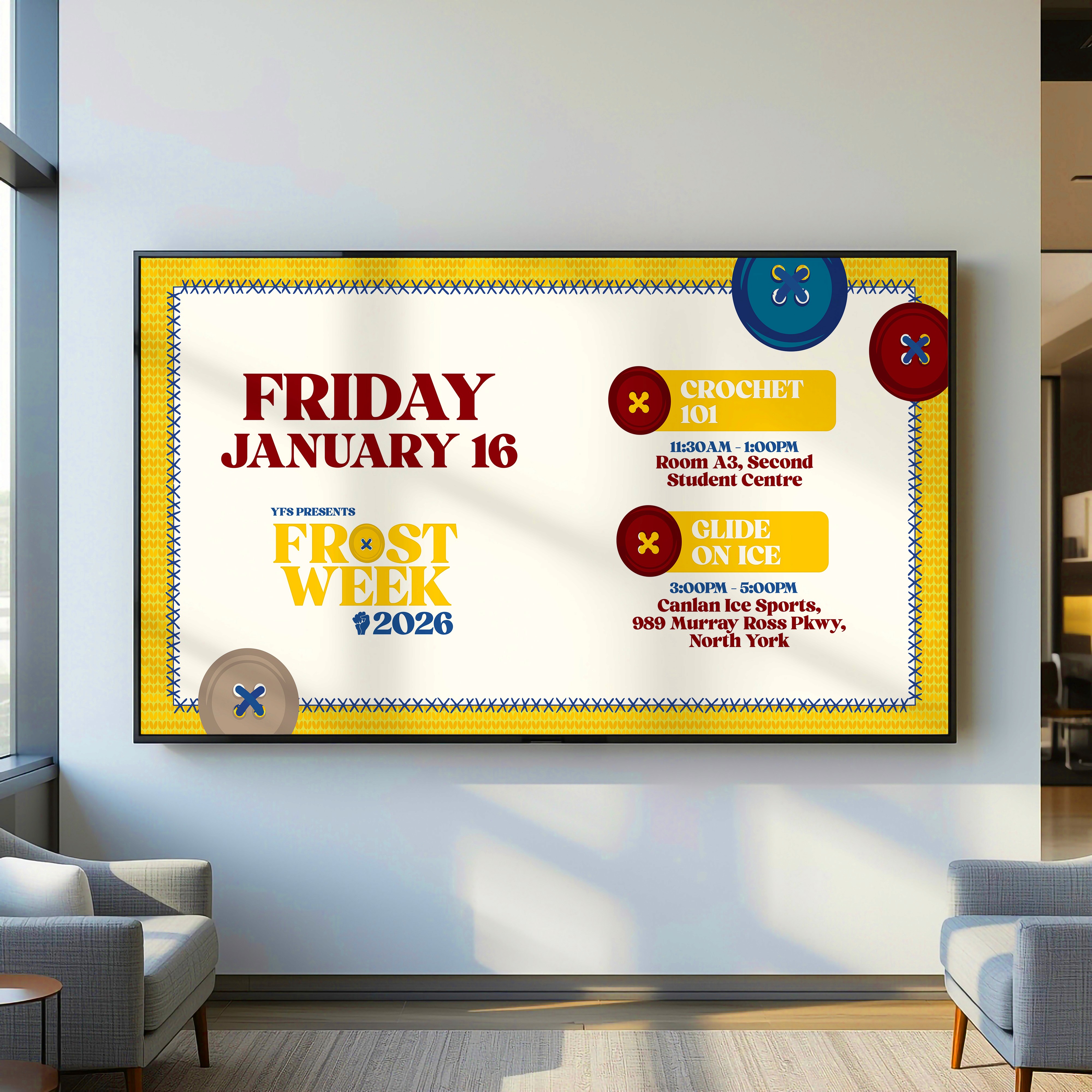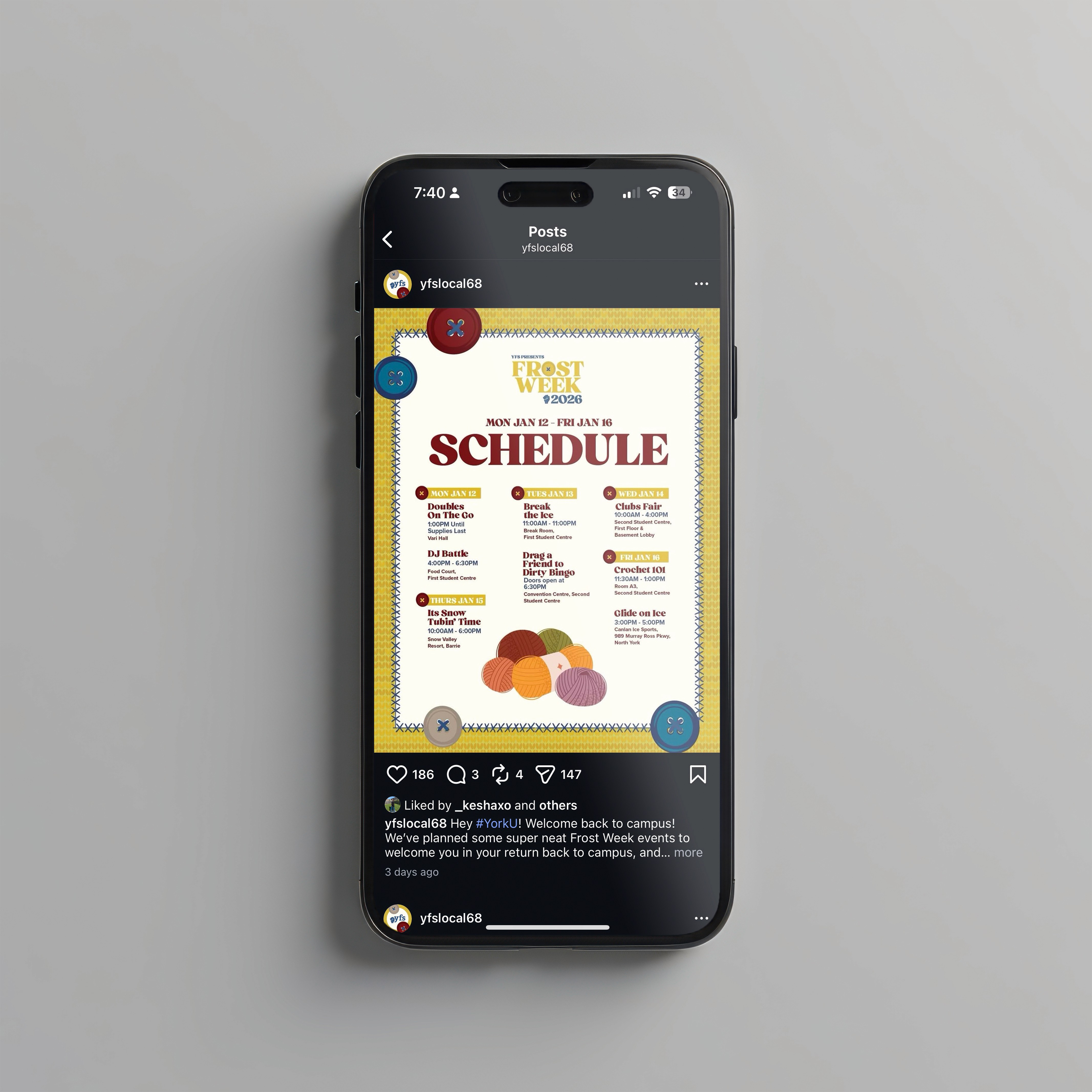 Each design includes the full schedule plus a unique look for each day of Frost Week, giving more context on the events and keeping things visually engaging. Posters and TV screens were displayed around campus, while the Instagram posts brought the designs online, helping students keep up with the schedule wherever they were.