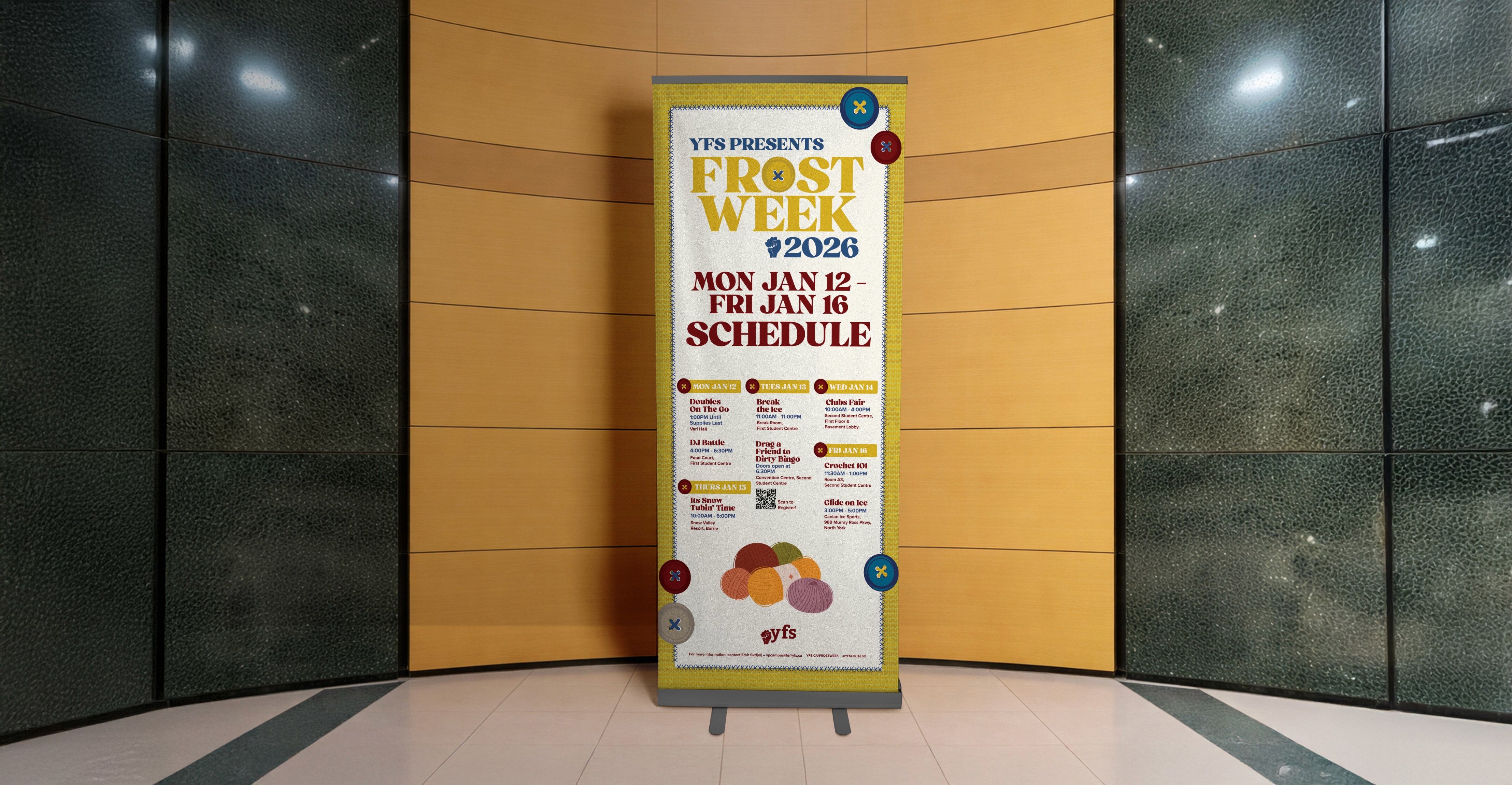 Frost Week was a week-long series of events at York University, full of winter activities, games, and other fun experiences for students. I worked as the lead designer, collaborating with the team to decide on the style, get feedback, and make sure everything felt clear and engaging. The style was inspired by a Ralph Lauren aesthetic, keeping it warm and cozy and steering away from traditional winter designs like blue tones and snowflakes. The standing banner shows the full schedule at a glance, bringing the week together in a way that’s easy to follow and visually exciting.