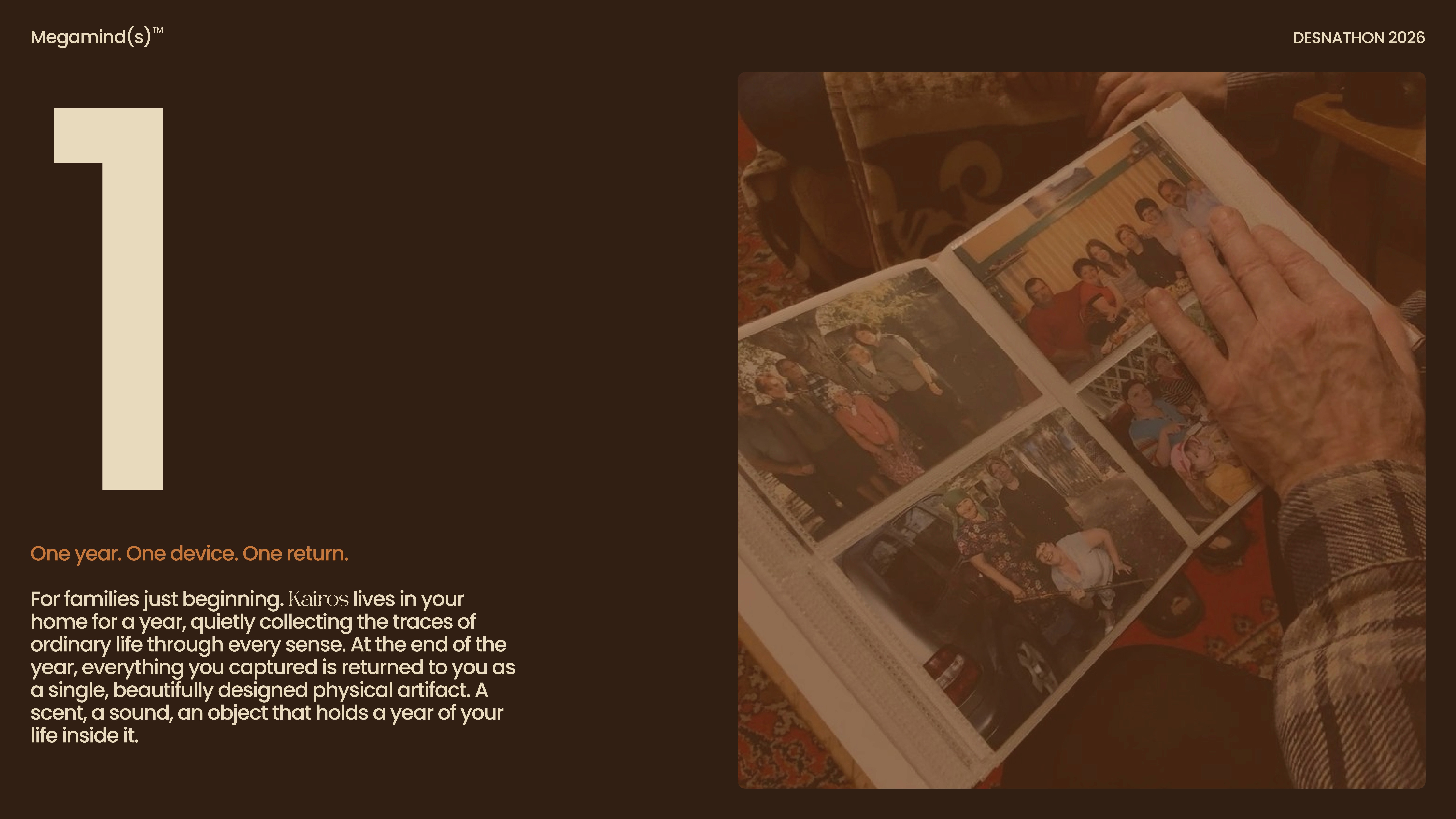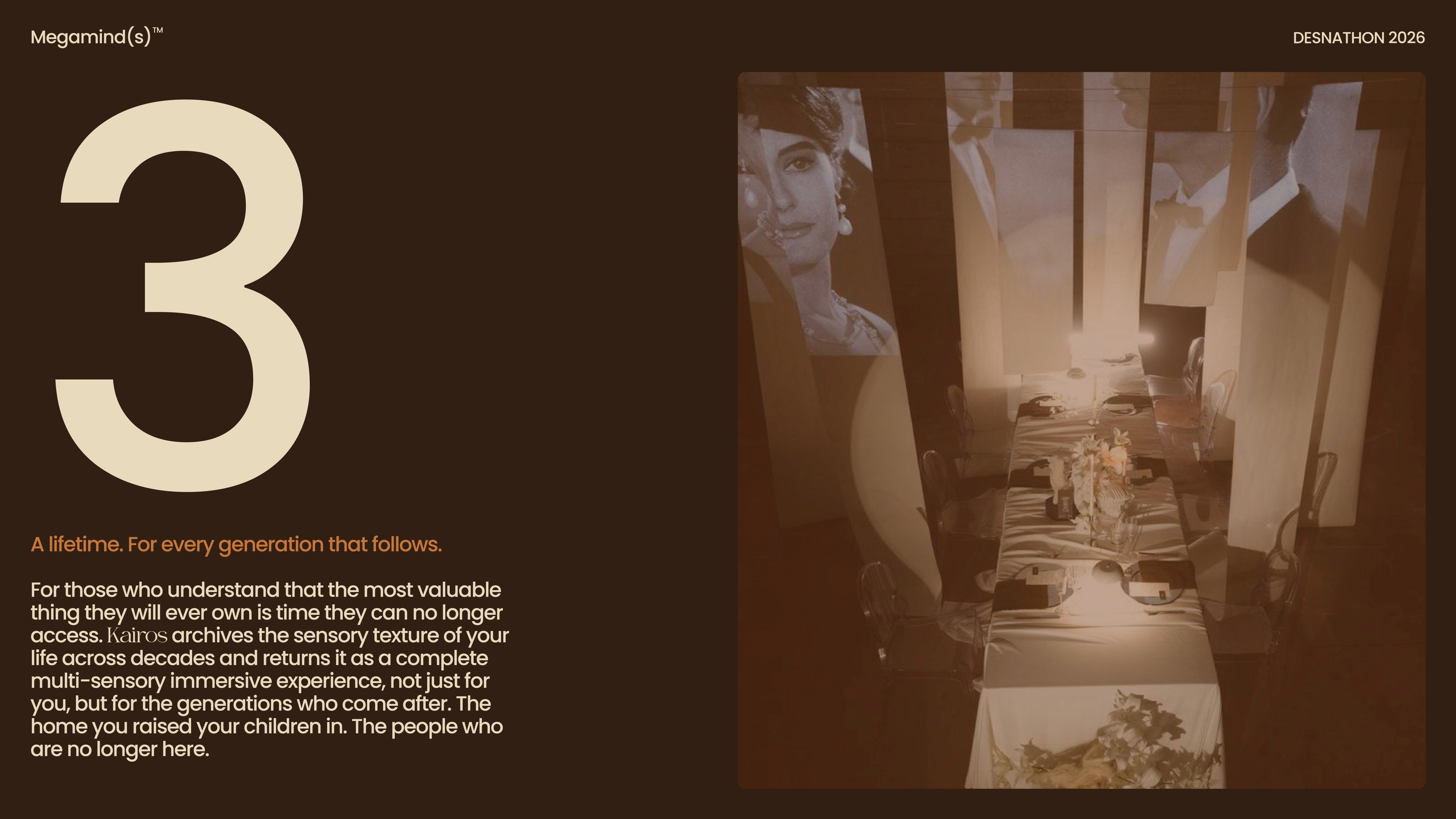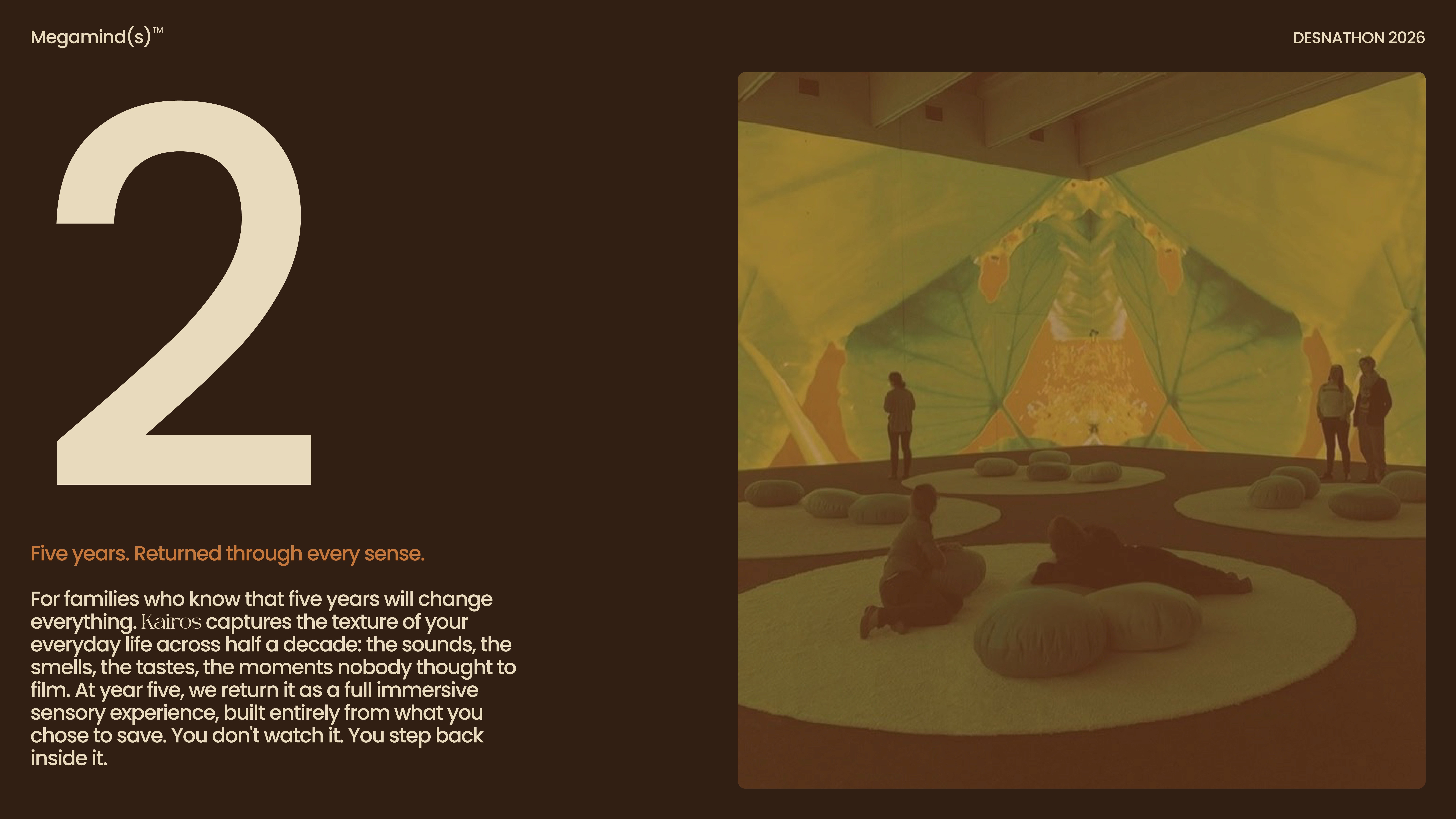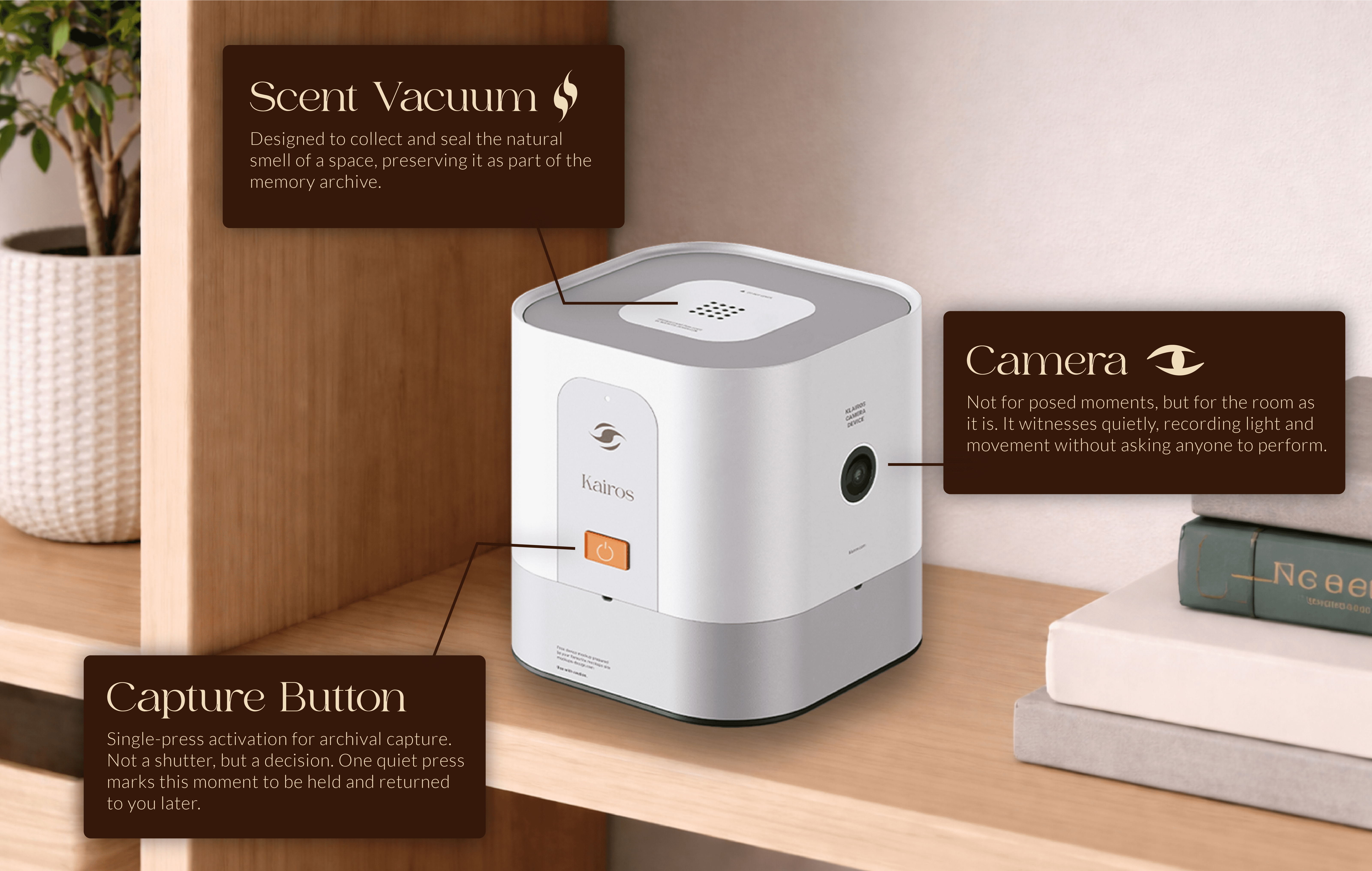 Kairos offers three ways of returning your memories, each shaped by how deeply you want to revisit your archive over time. The first returns everything after one year as a physical object containing a curated selection of your captured moments. The second extends to five years, transforming your archive into a fully immersive sensory experience built from your recorded life, designed to be stepped back into rather than viewed. The third is a generational archive that preserves your memories as a complete multisensory experience, holding not only moments, but the people and spaces connected to them for those who come after you.