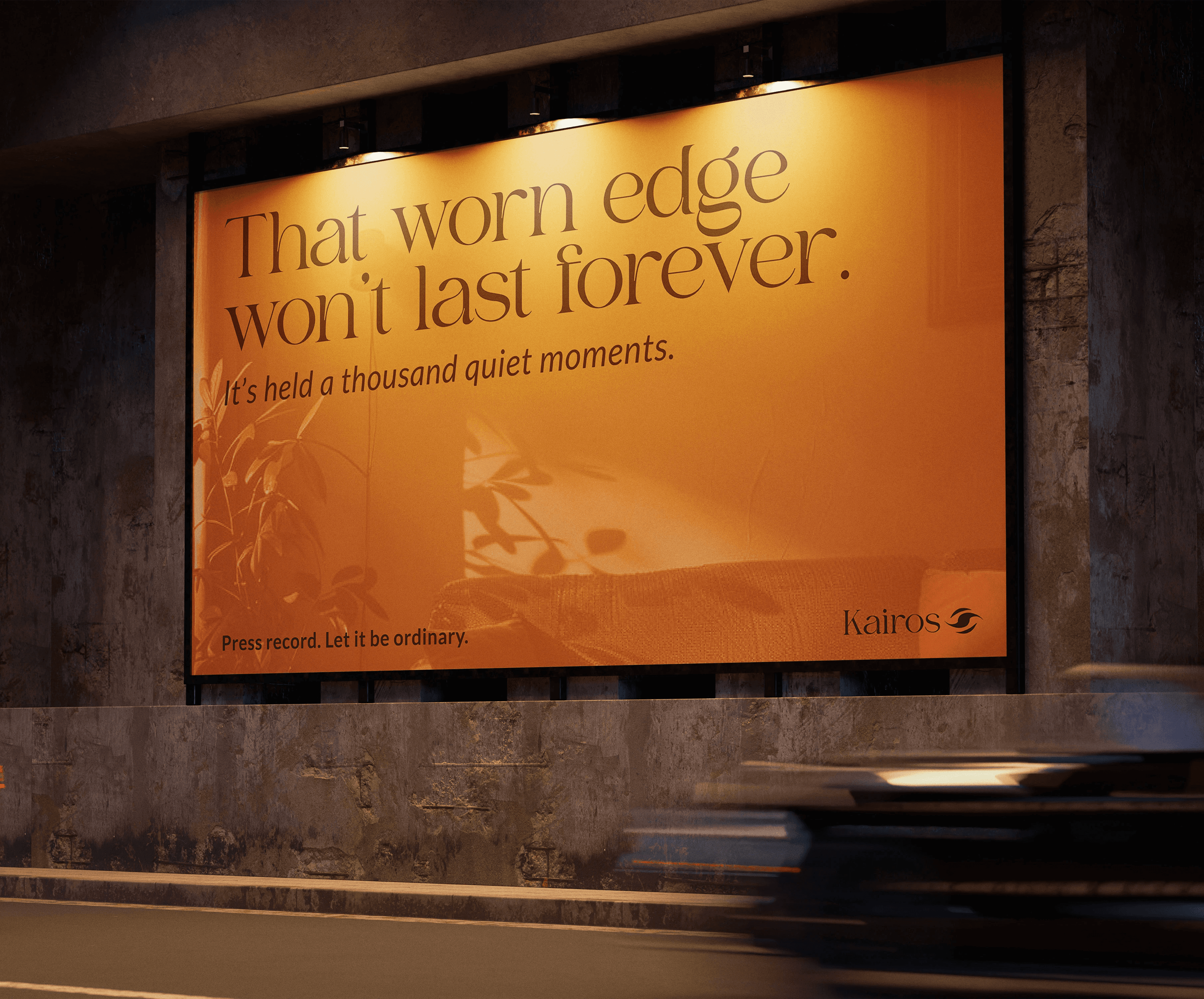he billboard and poster act as Kairos’ public-facing layer, introducing the idea of preserving the overlooked moments of everyday life. Placed in high-traffic and more intimate environments, they work together to interrupt routine and shift attention toward the ordinary details that are constantly passing unnoticed. The messaging is kept minimal and reflective, designed to create curiosity and emotional pause.