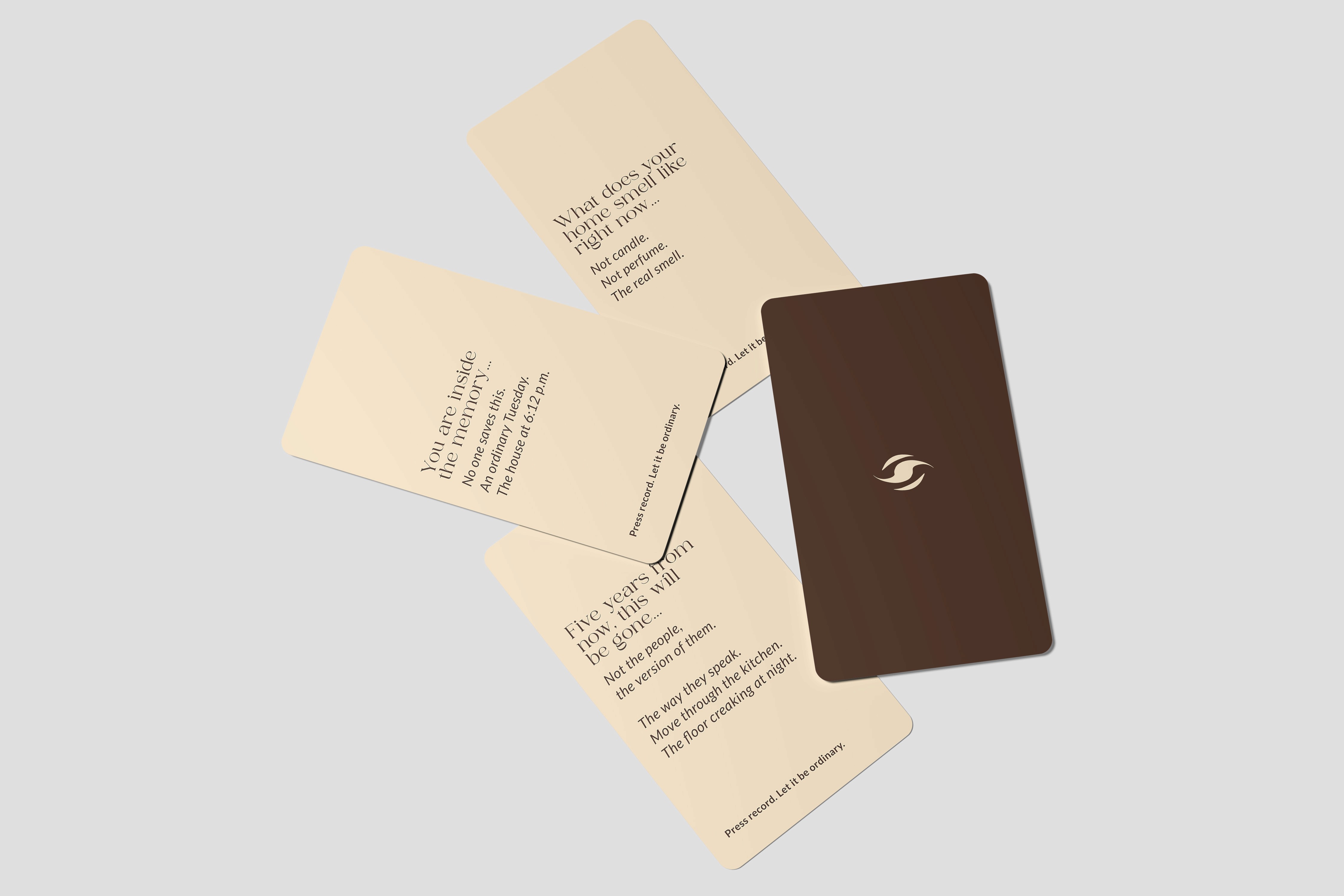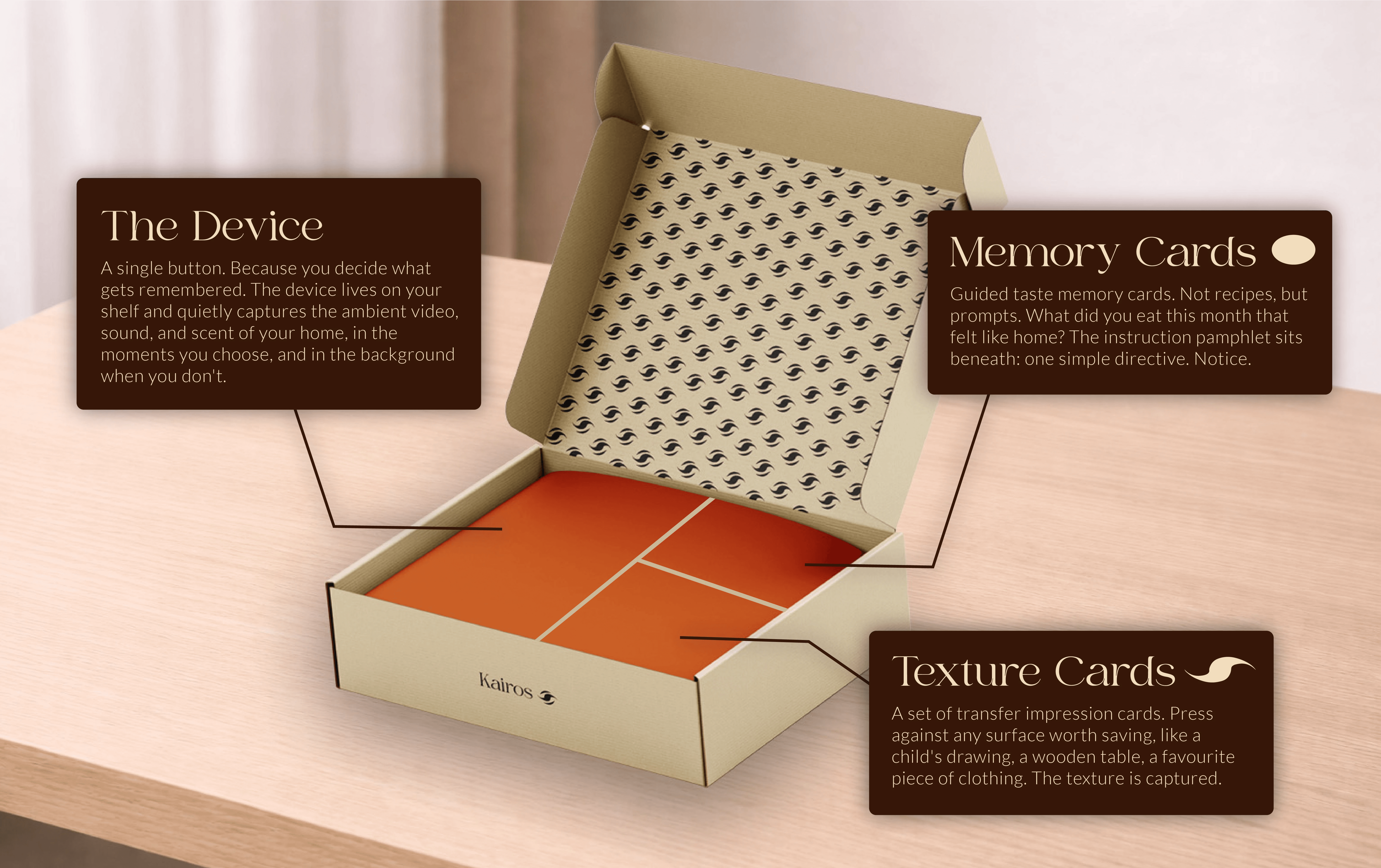 When you become a Kairos client, a kit arrives at your door to begin your personal archive of everyday life. It includes a simple recording device and guided tools that prompt you to notice rather than perform your daily moments. The device captures video, sound, and scent through a single capture button, while memory and texture cards extend what can be recorded through reflection and touch. Together, the kit builds a multisensory archive of ordinary life across all five senses.